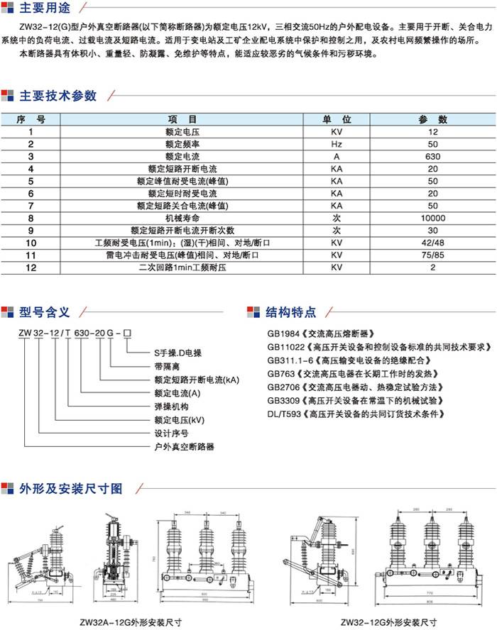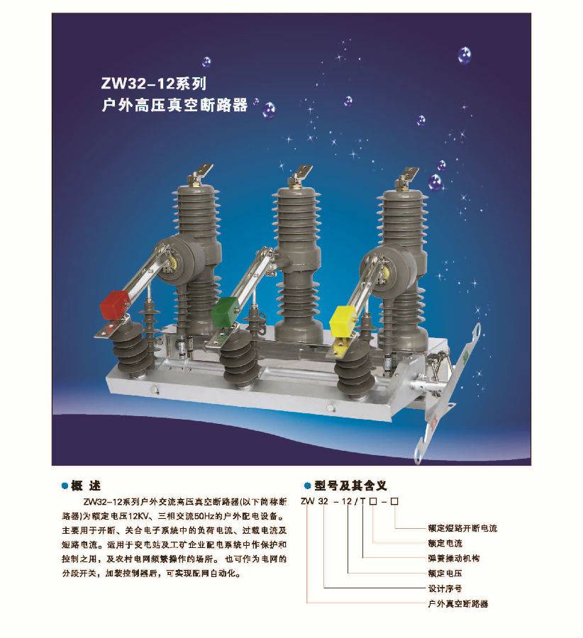 ZW32-12、ZW32-12G系列柱式戶外高壓真空斷路器是三相交流50Hz、額定電壓12kV的戶外高壓開關(guān)設備。適用于開斷、關(guān)合城市或農(nóng)村配電系統(tǒng)的負荷電流、過載電流、短路電流。