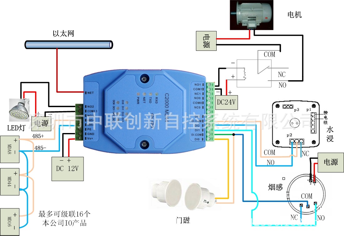→RS485接口可作為擴(kuò)展接口,連接MD44、MDA8、MD82、MD88、MD16等模塊;