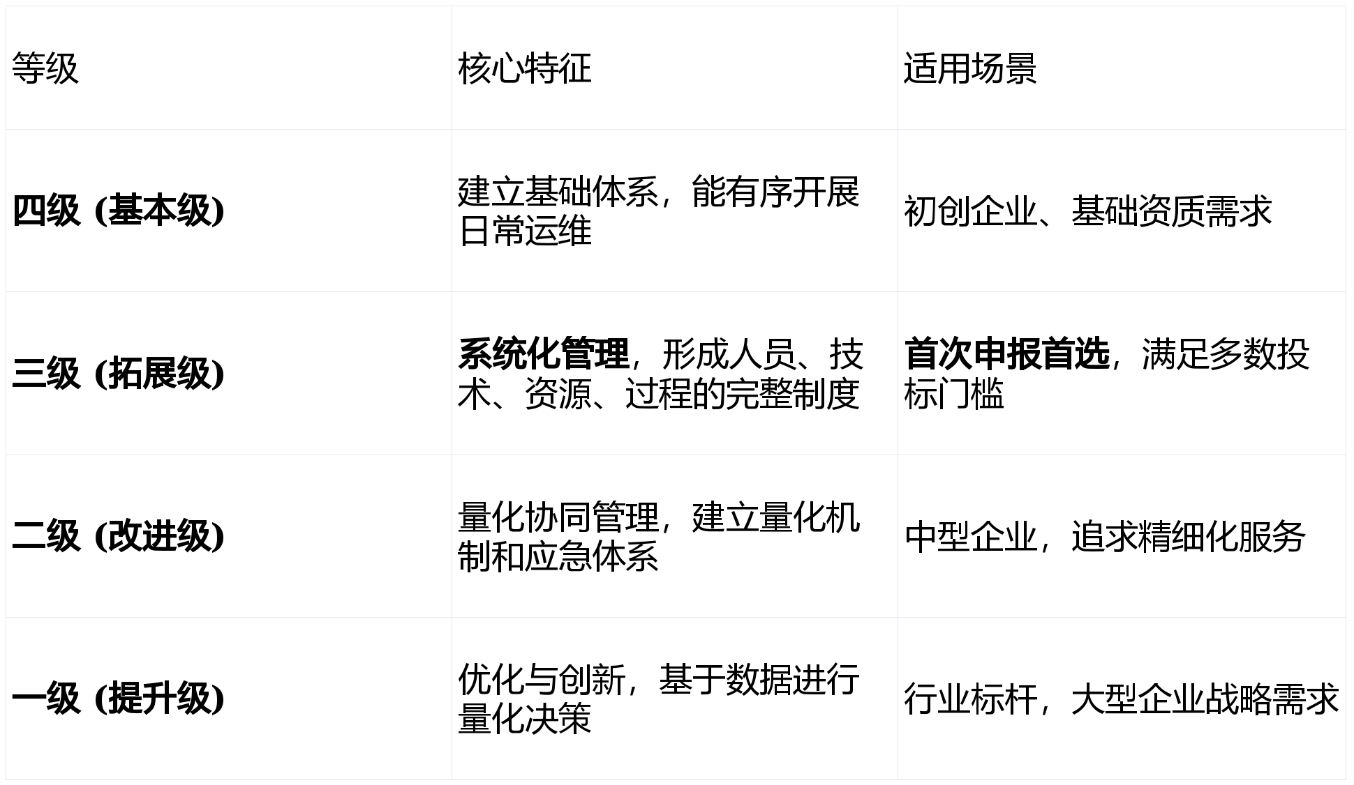 ITSS認證采用四級分級制,等級越高代表企業(yè)服務(wù)能力越強。目前市場上,三級(拓展級) 是大多數(shù)企業(yè)shou次申報的shou選,也是多數(shù)政企項目招標(biāo)的“準(zhǔn)入門檻”。
